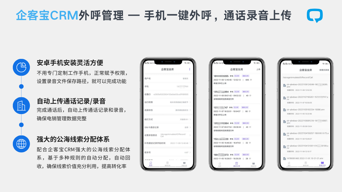 对于电销占比较高的企业来说,企客宝的这一优势堪称“杀手锏”。它支持包括手机坐席、网络线路、固话线路等多种外呼模式,能全面适配市面上常见的电销卡、回拨线路等外呼业务模式。这意味着销售团队可以直接在系统内一键拨号、自动记录通话、并快速进行客户分类,极大提升了外呼效率和客户信息管理的便捷性。
