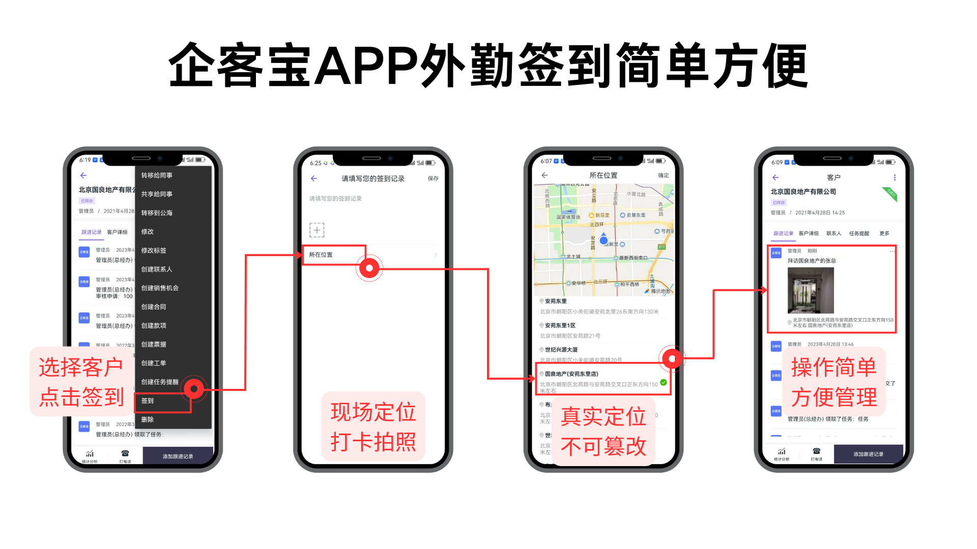 针对以上痛点,企客宝CRM的手机APP用客户签到功能轻松搞定。