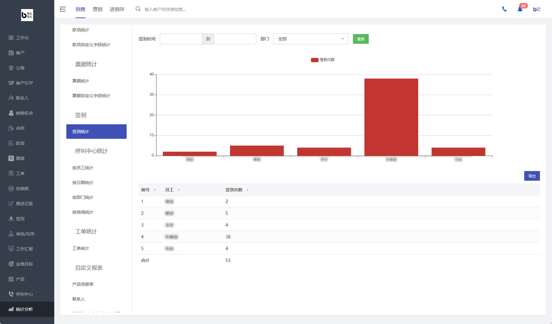 还有签到统计页面,每个外勤员工的打卡情况,领导一目了然。