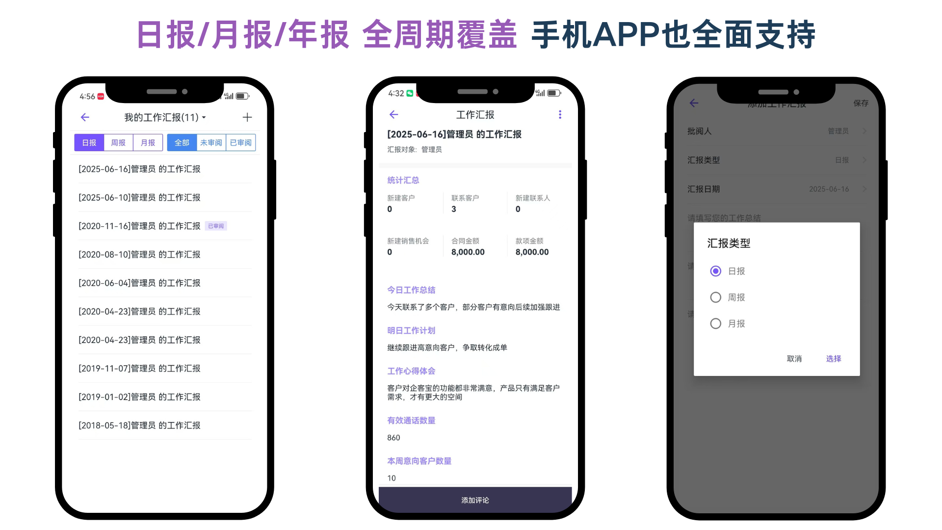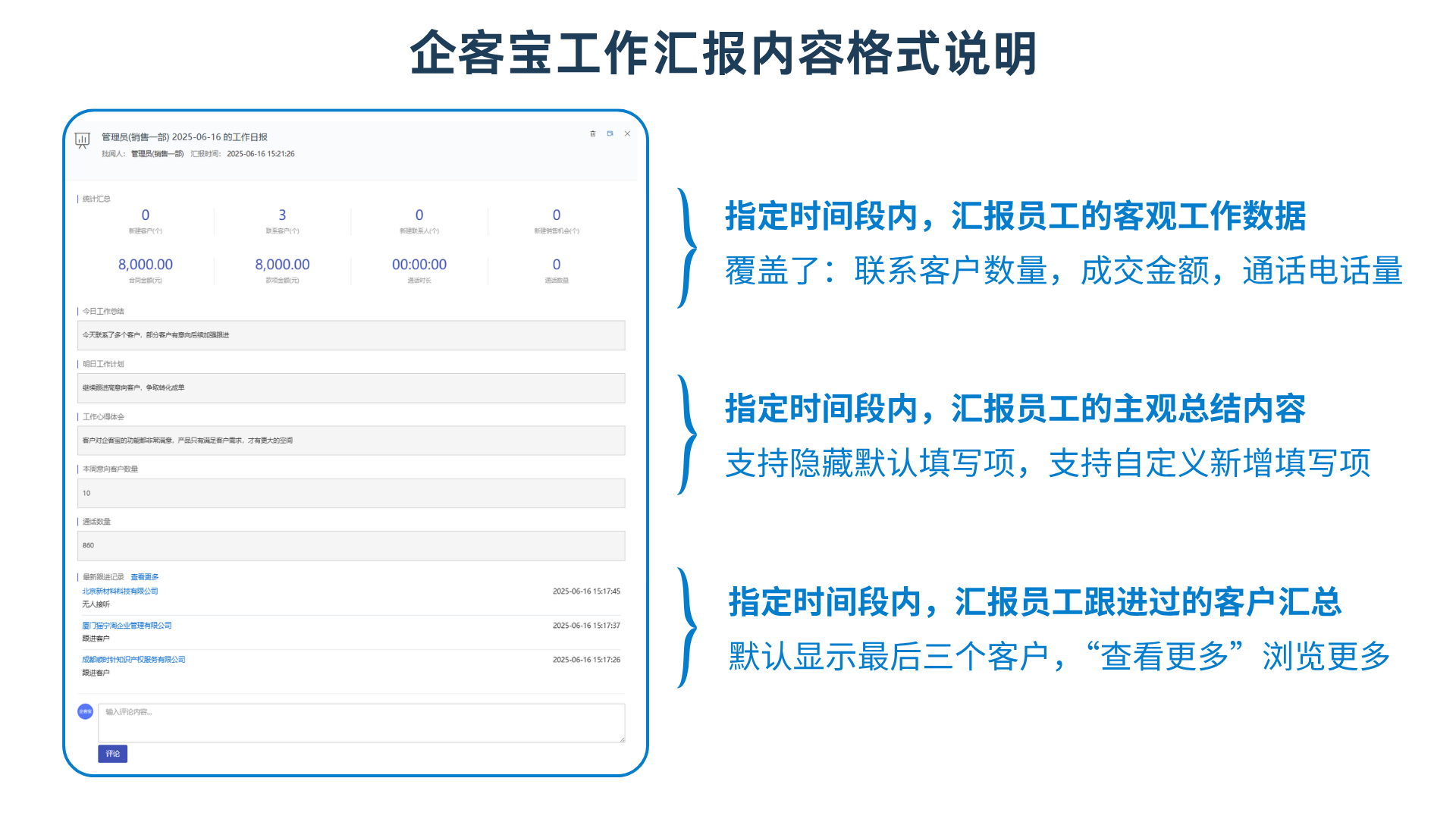 企客宝的工作汇报支持日报,月报,年报三种模式。