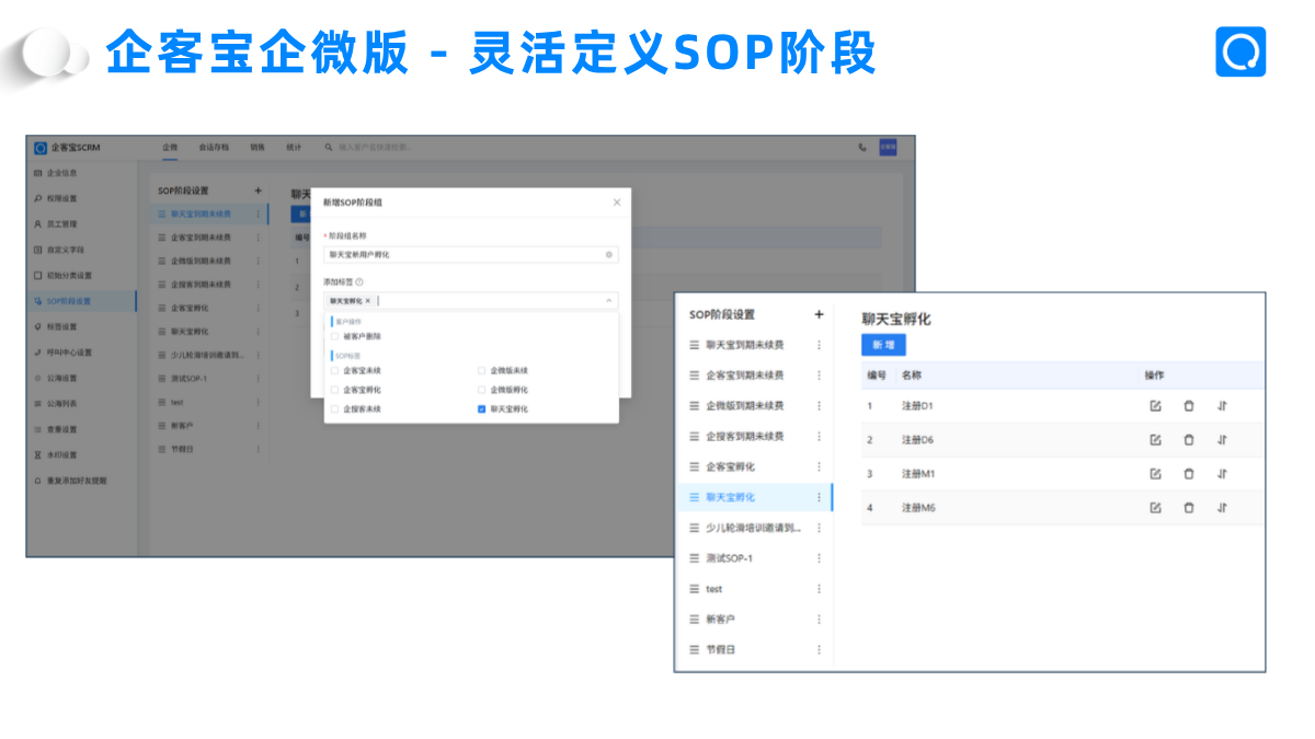 企客宝企微版的SOP功能设计理念基于客户生命周期管理,允许企业根据自身业务需求,灵活创建阶段组和具体执行阶段。