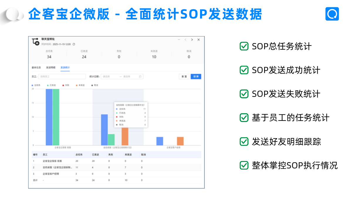 企客宝企微版SOP功能的另一大优势是全流程的数据监控与分析能力。品牌运营人员可以随时在后台查看营销活动的整体效果。