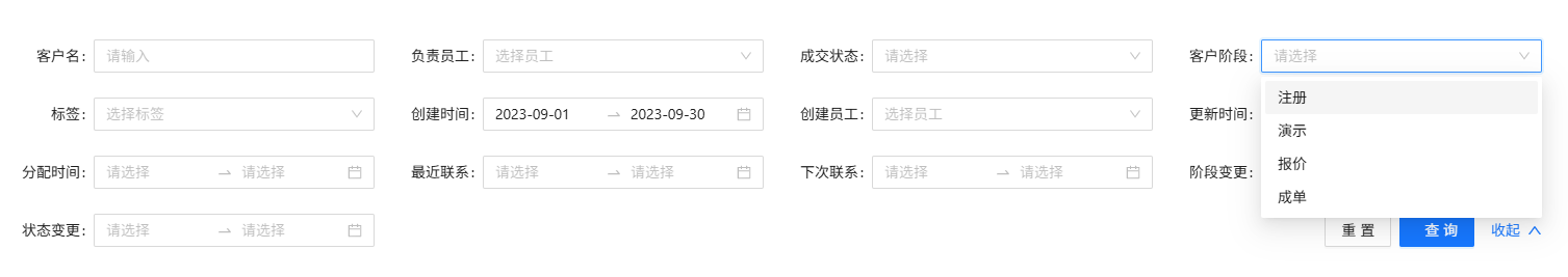 支持按「客户阶段变更时间」查询(如:“6月内从‘演示’阶段变为‘报价’阶段的客户”),精准捕捉销售推进动态,识别转化瓶颈与机会点。