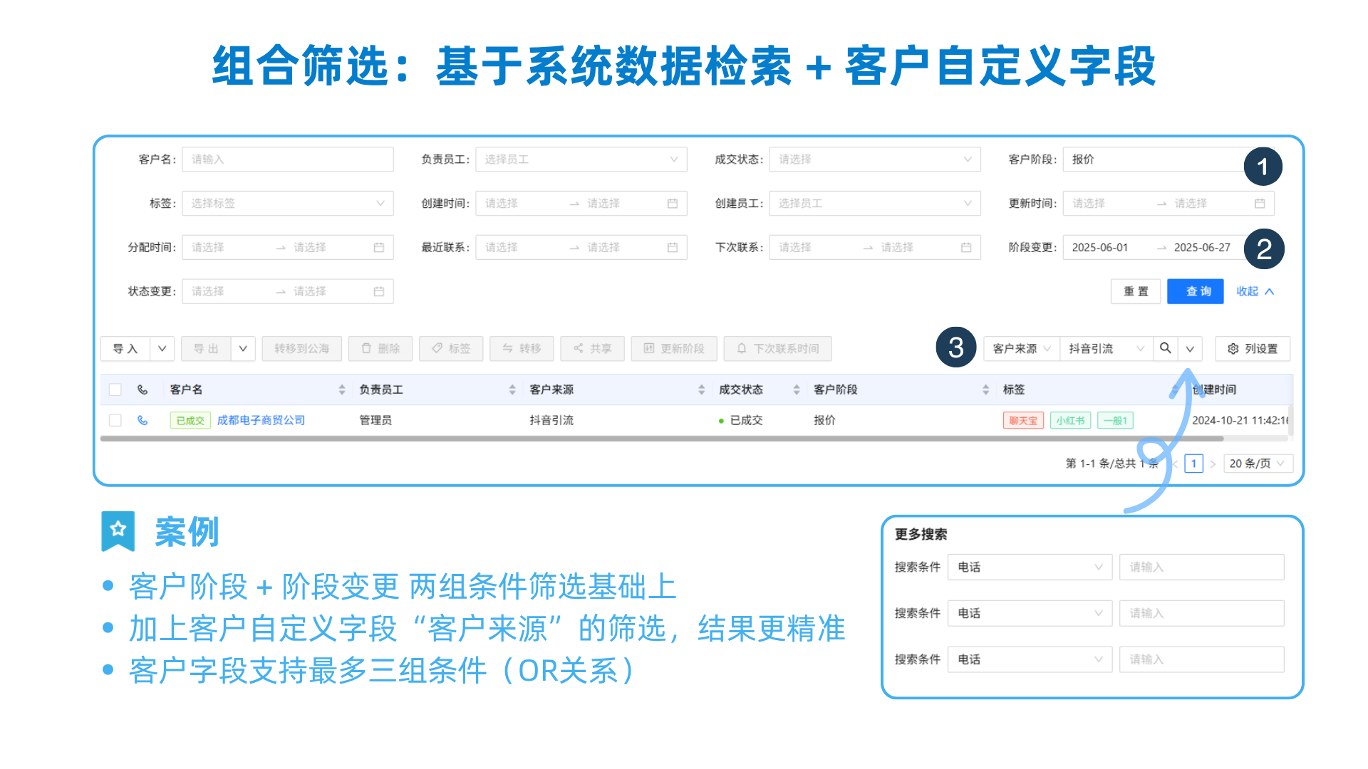 例如要检索:在6月份客户阶段变更为“报价”的,并该客户来源为“抖音引流”的客户列表,就需要系统级数据和客户自定义字段的组合筛选。