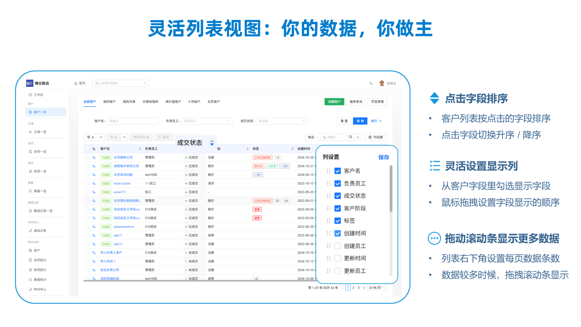 用户完全自定义列表显示字段(如:客户名称、联系人、阶段、预计成交额、最后跟进时间、自定义字段等),只关注核心信息。