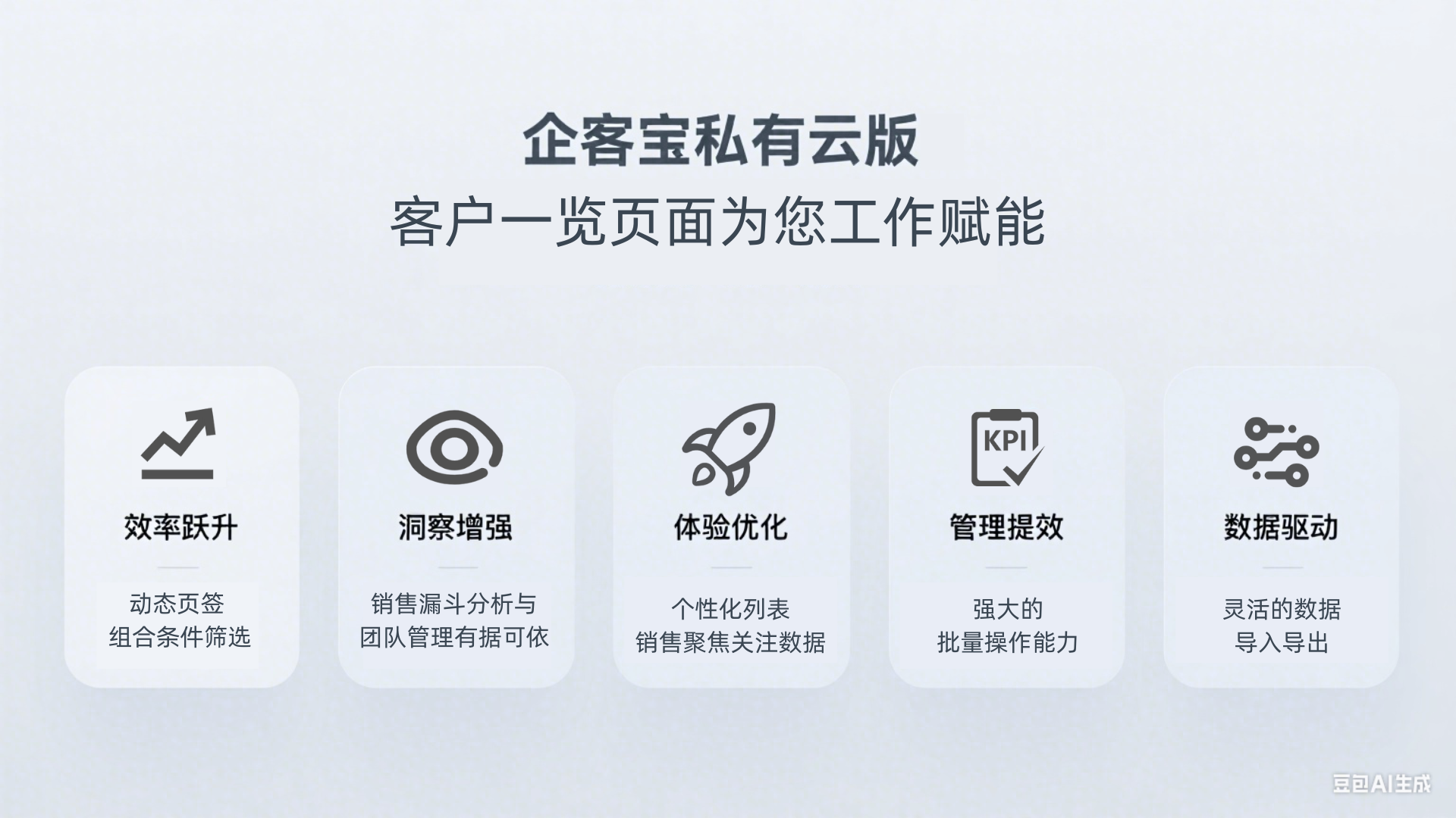企客宝私有云 支持私有云部署,数据私有掌控安全放心,一次买断永久使用。企客宝私有云基于最新技术架构,具备客户管理,公海,合同,款项等实用功能,从线索分配,到客户跟进,成单转化,覆盖销售管理全流程。具备灵活的权限和字段自定义,全面的系统日志和数据安全管控,安全可靠,经济实惠。更有一对一的专业客服支持,欢迎您咨询试用!